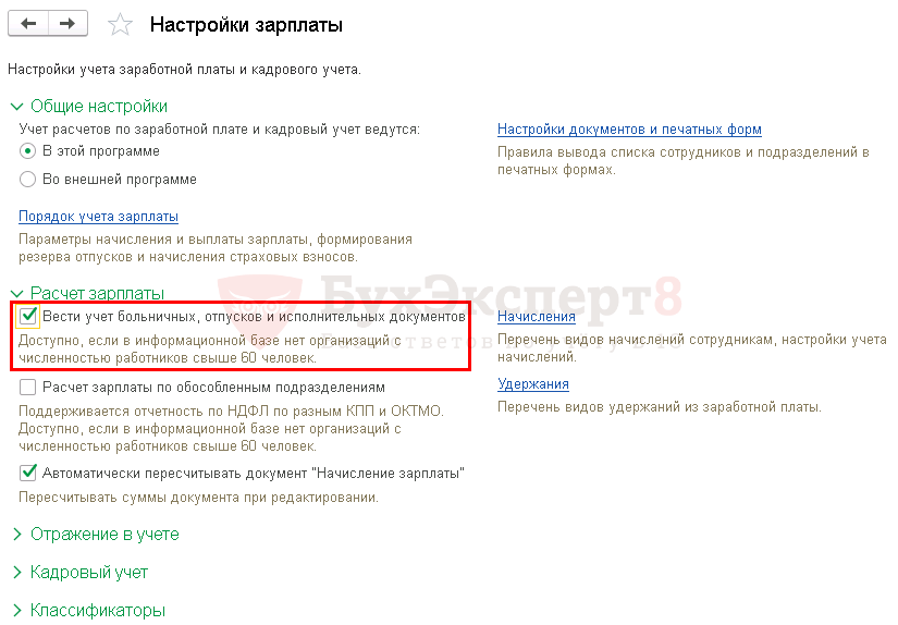 Когда в базе ведется несколько организаций и численность хотя бы одной из них свыше 60 человек, автоматический расчет больничных, отпусков и удержаний по исполнительным документам будет недоступен.