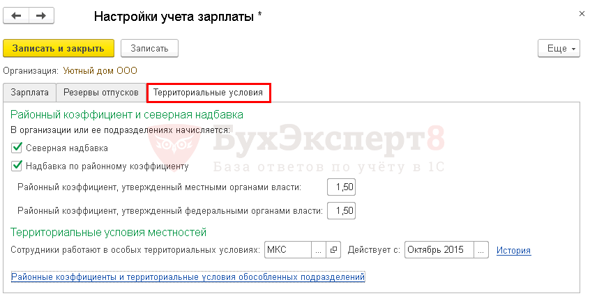 На вкладке Территориальные условия устанавливаются параметры учета надбавок к заработной плате в соответствии с федеральными или региональными законами.