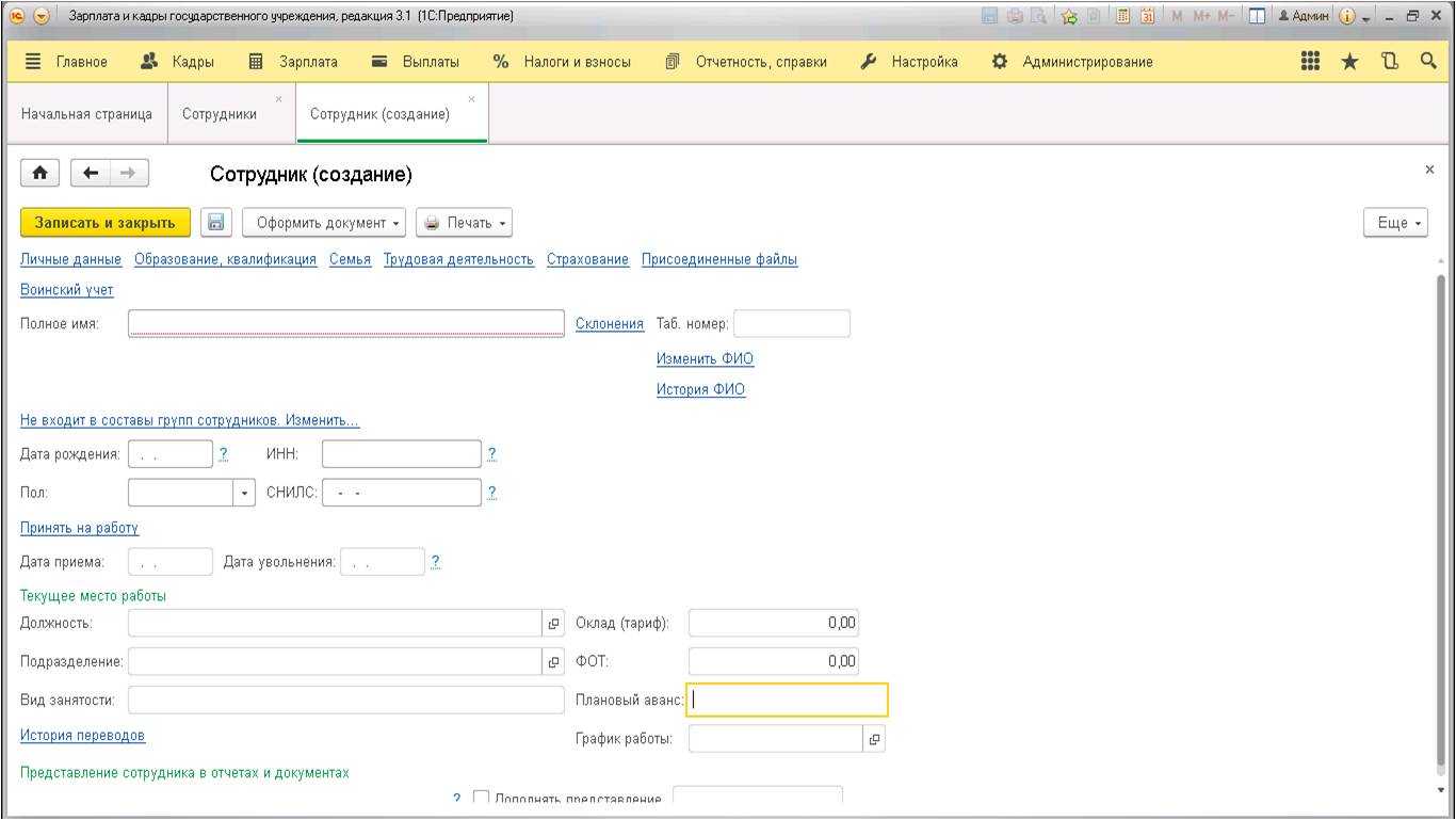 Изначально вид начисления аванса в 1С ЗУП задается кадровыми документами, изменением оплаты труда, аванса и т. п. В рамках данной статьи мы будем настраивать аванс при приеме на работу.