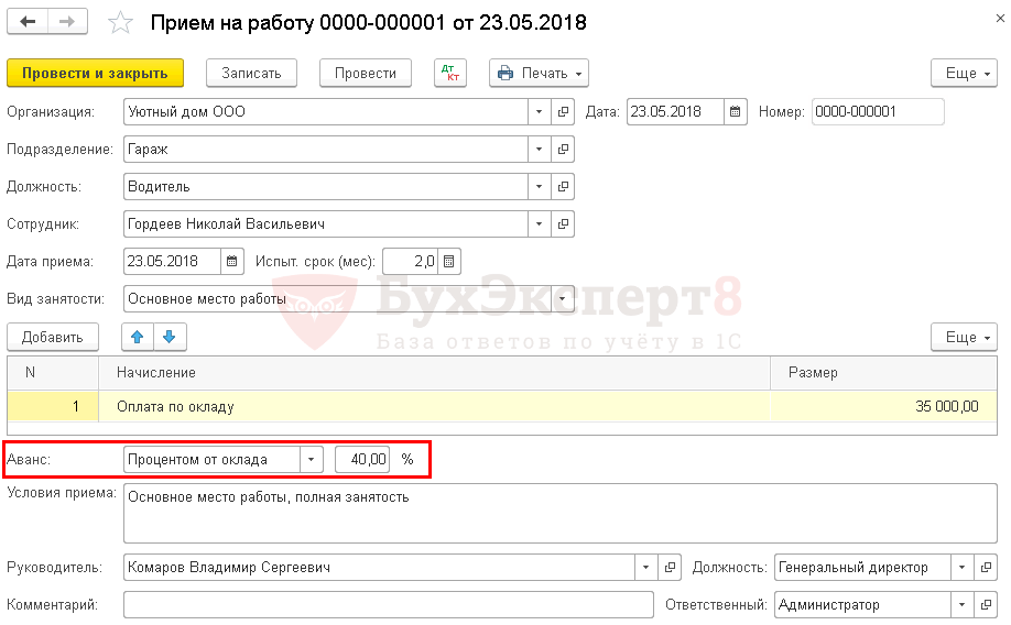 Мы создали прием сотрудника на работу, и перешли на вкладку «Оплата труда». В нижней части окна из соответствующего выпадающего списка можно выбрать один из способов начисления аванса, о которых говорилось ранее. В данном случае аванс Ванькову Александру Матвеевичу будет выплачиваться в размере 35% от тарифа (фонда оплаты труда). По умолчанию это значения равнялось сорока процентам.
