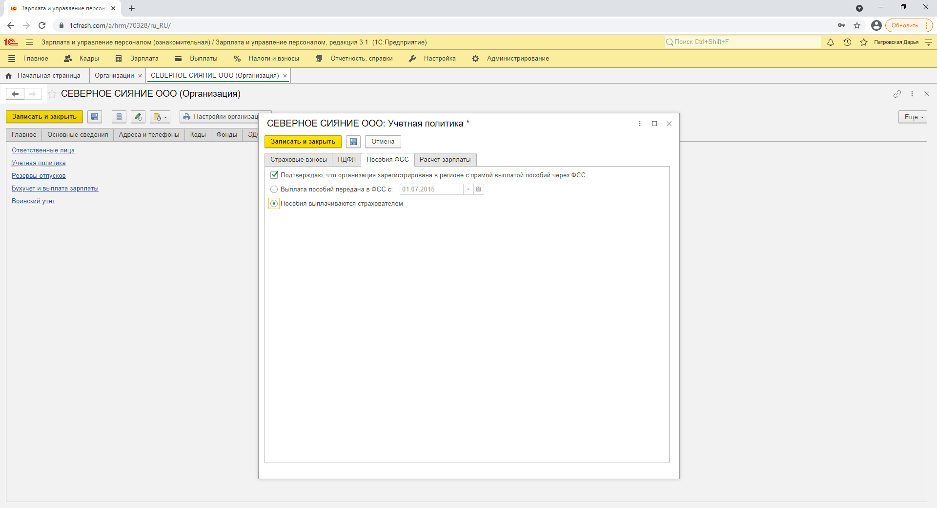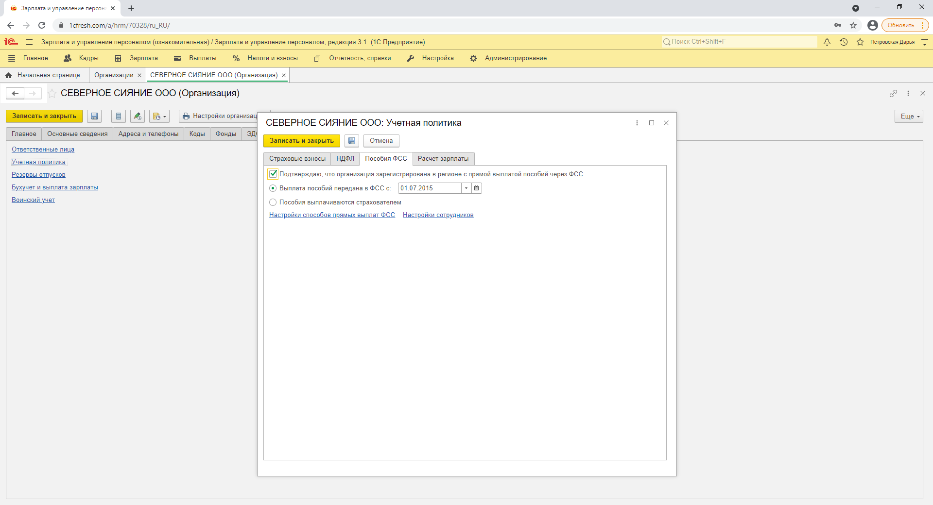 В «1С:Зарплата и управление персоналом 8» необходимо обозначить, что компания – участник прямых выплат. Для этого пойдем в карточку организации («Настройки» – «Организации»). На вкладке «Учетная политика и другие настройки» выберем ссылку «Учетная политика». В высветившемся окне, в учетной политике, поставим флаг «Подтверждаю, что организация зарегистрирована в регионе с прямой выплатой пособий через ФСС», а также укажем дату с какого момента происходит выплата пособий через ФСС.