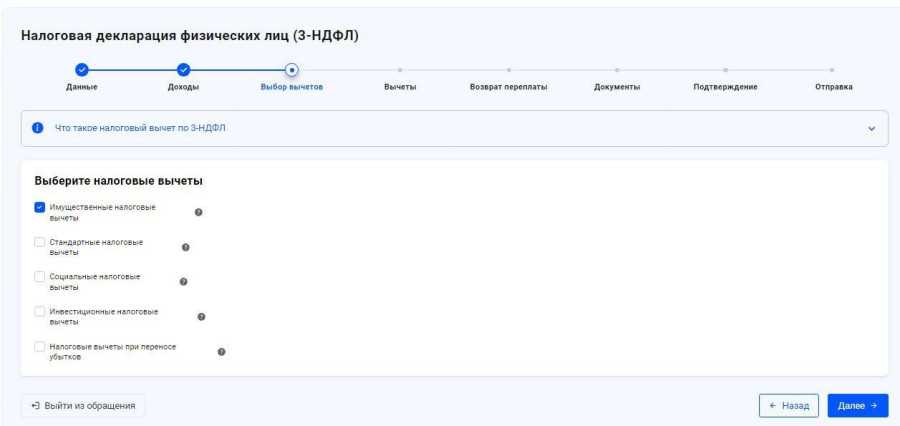 - Следующим этапом следует поставить галочки перед всеми налоговыми вычетами, на которые претендуете: