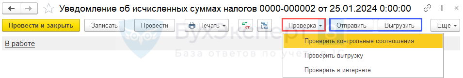 Уведомление об исчисленных суммах налогов отправьте в ИФНС по кнопке Отправить или выгрузите для отправки через стороннего оператора.