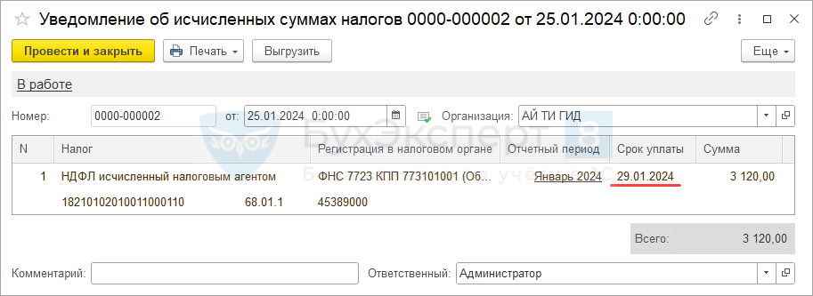 Формирование уведомления по НДФЛ с 1 по 22 января 2024 в 1С