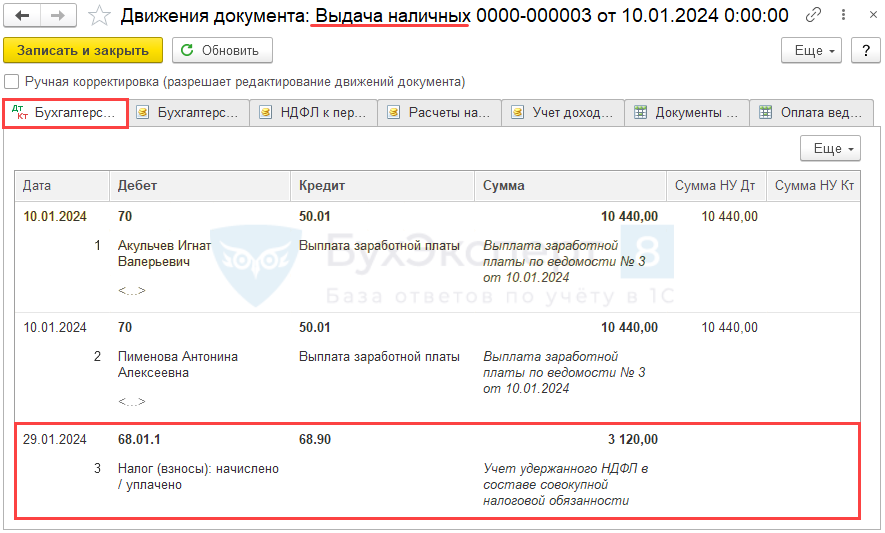 С января 2024 года обязанность по НДФЛ автоматически учитывается на ЕНС документами выдачи зарплаты: Выдача наличных, Списание с расчетного счета (с релиза 3.0.147).