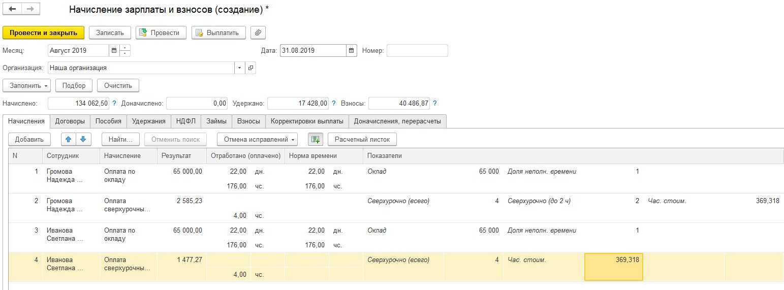 Теперь можно сформировать документ «Начисление зарплаты». Заполнение его происходит автоматически. Видно, что у работников имеется расчет за сверхурочную работу, помимо основного оклада. При этом результат у всех разный из-за того, что вид компенсации у каждого выбран свой.