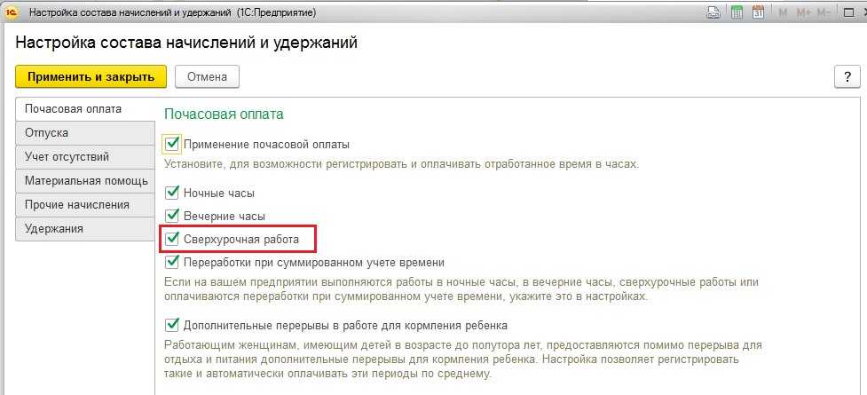 Процесс регистрации сверхурочных в 1С начинается с настройки. В разделе «Настройка» нужно зайти в «Расчёт зарплаты», а затем — в раздел «Настройка состава начислений и удержаний». На вкладке «Почасовая оплата» устанавливается пометка «Сверхурочная работа».