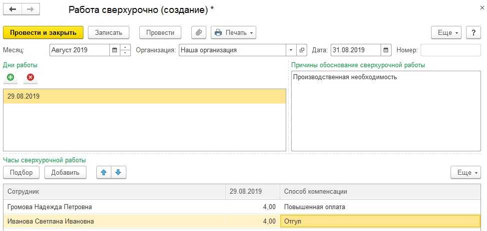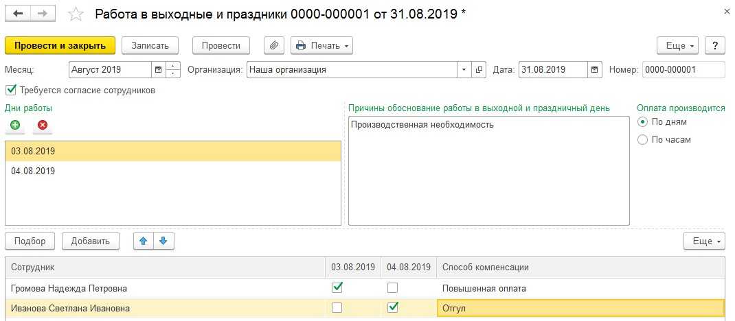 Заполненный документ необходимо провести. Кнопка «Печать» позволяет получить печатный вариант приказа о выполнении работ в выходные или праздничные дни.