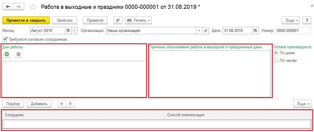 После этого необходимо создать документ «Работа в выходные и праздники» в разделах: «Кадры», «Зарплата». Когда откроется форма для заполнения, станет видно, что основное поле документа разделено на три блока.