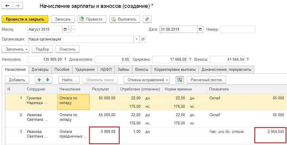 На примере видно, что Громова Надежда компенсировала выход в праздничный день отгулом и отдыхала в текущем месяце. Следовательно, ее зарплата не была увеличена. Ивановой Светлане, наоборот, расчет оплаты выполнен в двойном размере.