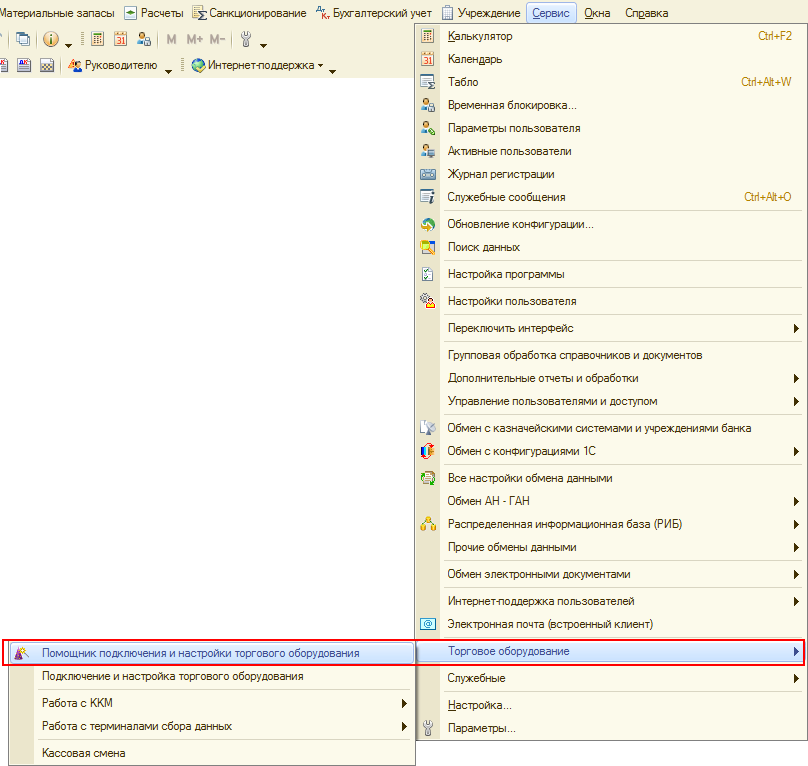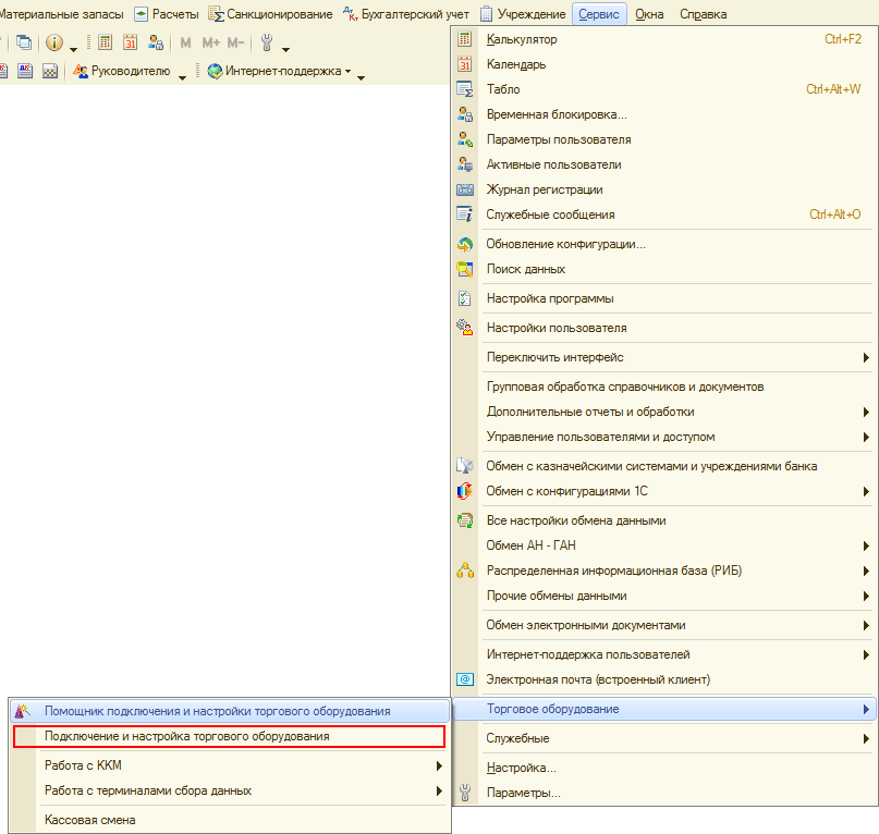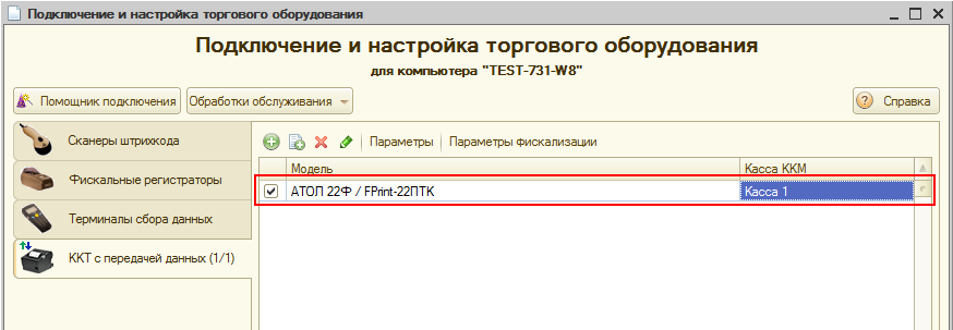 После выполнения настройки оборудования следует привязать его к кассе, которую будет обслуживать это оборудование. Для этого следует воспользоваться обработкой Подключение и настройка торгового оборудования (меню «Сервис — Торговое оборудование» главного меню программы).