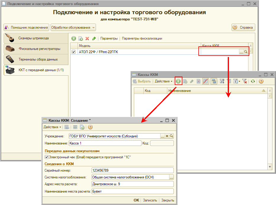 В открывшемся окне следует перейти на закладку ККТ с передачей данных и для выбранного в списке оборудования в графе Касса ККМ указать кассу.