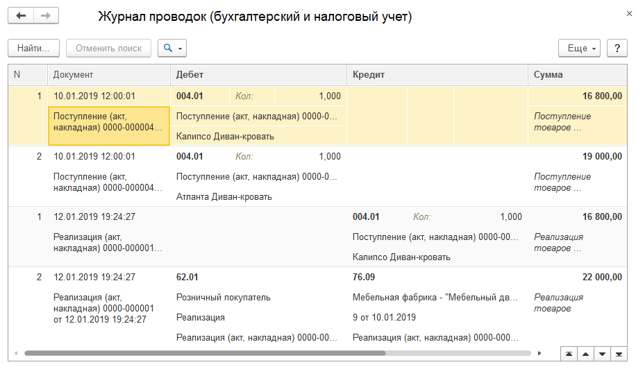 Регистр бухгалтерии под названием ««Журнал проводок (бухгалтерский и налоговый учет)» открывается двойным кликом по нему мышки. Там присутствует таблица с записями хозопераций, произведенных документами. Данные отображаются в хронологическом порядке.