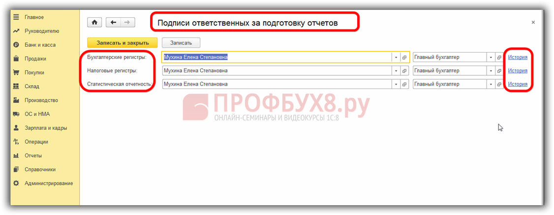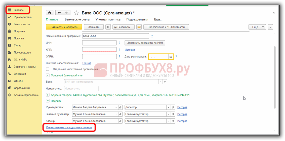Назначить ответственного за ведение регистра в 1С 8.3 Бухгалтерия можно в разделе меню Главное – Реквизиты организации – Подписи: