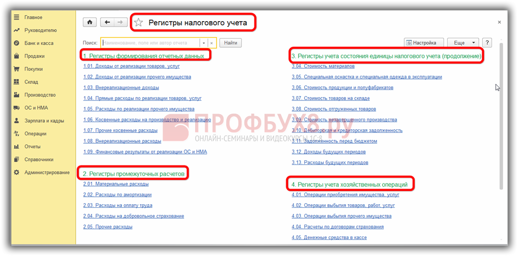 Кнопка «Регистры налогового учета» открывает список доступных для формирования документов. Данный блок сгруппирован в 4 раздела: