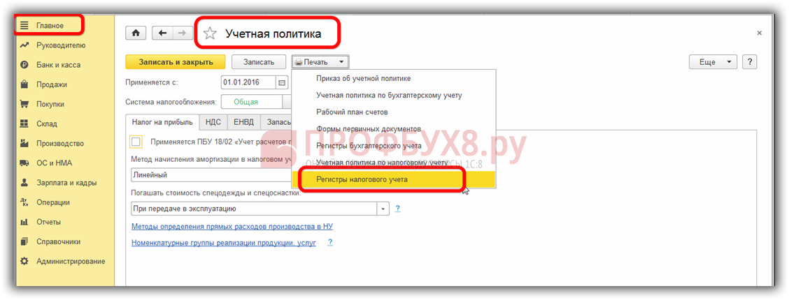 В конфигурации 8.3 разработчиками программы 1С предоставлена возможность распечатать регистры налогового учета к учетной политике в разделе Главное – Учетная политика: