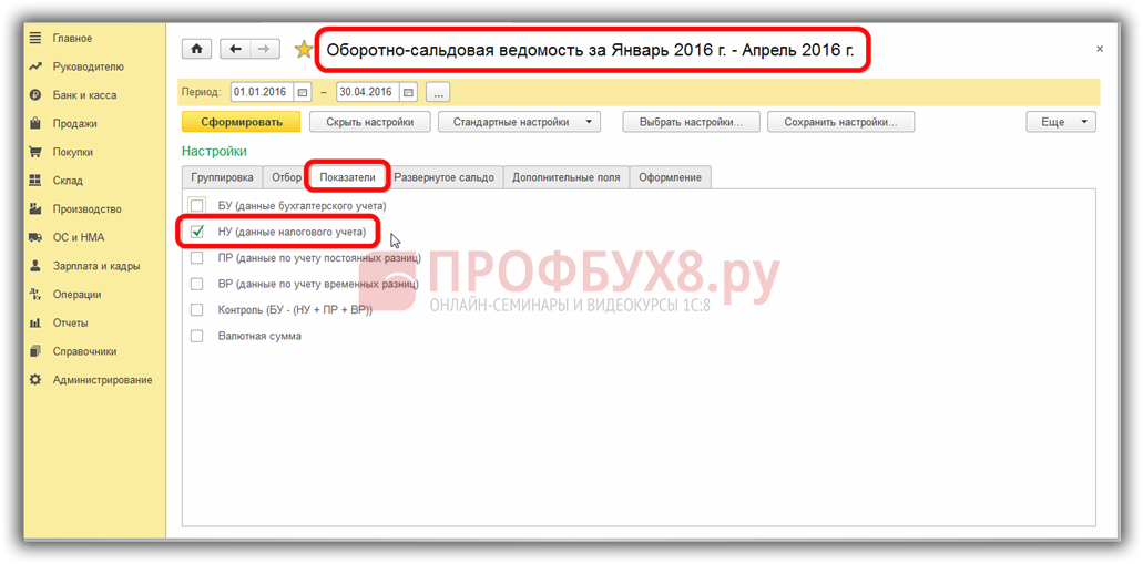 Форма же регистров, их перечень и содержание оставлены на усмотрение самих налогоплательщиков. Главное, чтобы они раскрывали порядок формирования налоговой базы. Разрешено даже использовать в этом качестве бухгалтерские регистры, если они содержат достаточно для расчета налога данных. В программе 1С 8.3 это могут быть оборотно-сальдовые ведомости, если их настроить следующим образом: