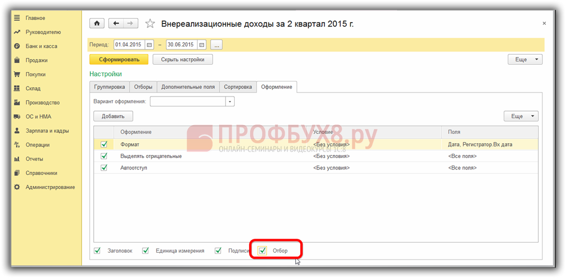 Добавив этот реквизит в отчет, увидим параметры, по которым в программе 1С 8.3 настроен отбор данных в конкретный регистр: