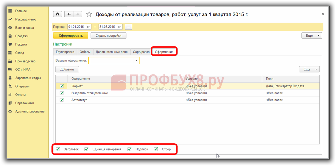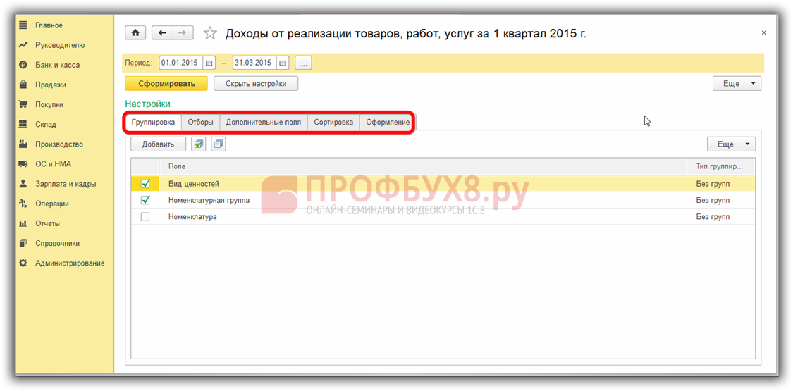 Рассмотрим, какие настройки доступны внутри самих регистров. Как обычно, это Группировка, Отборы, Дополнительные поля, Сортировка, Оформление:
