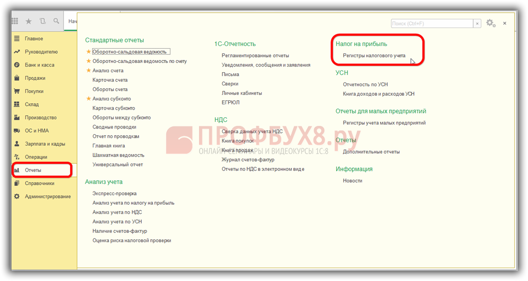 Для формирования регистров, отражающих налоговую информацию, в 1С нужно перейти в раздел «Отчеты», подраздел «Налог на прибыль».
