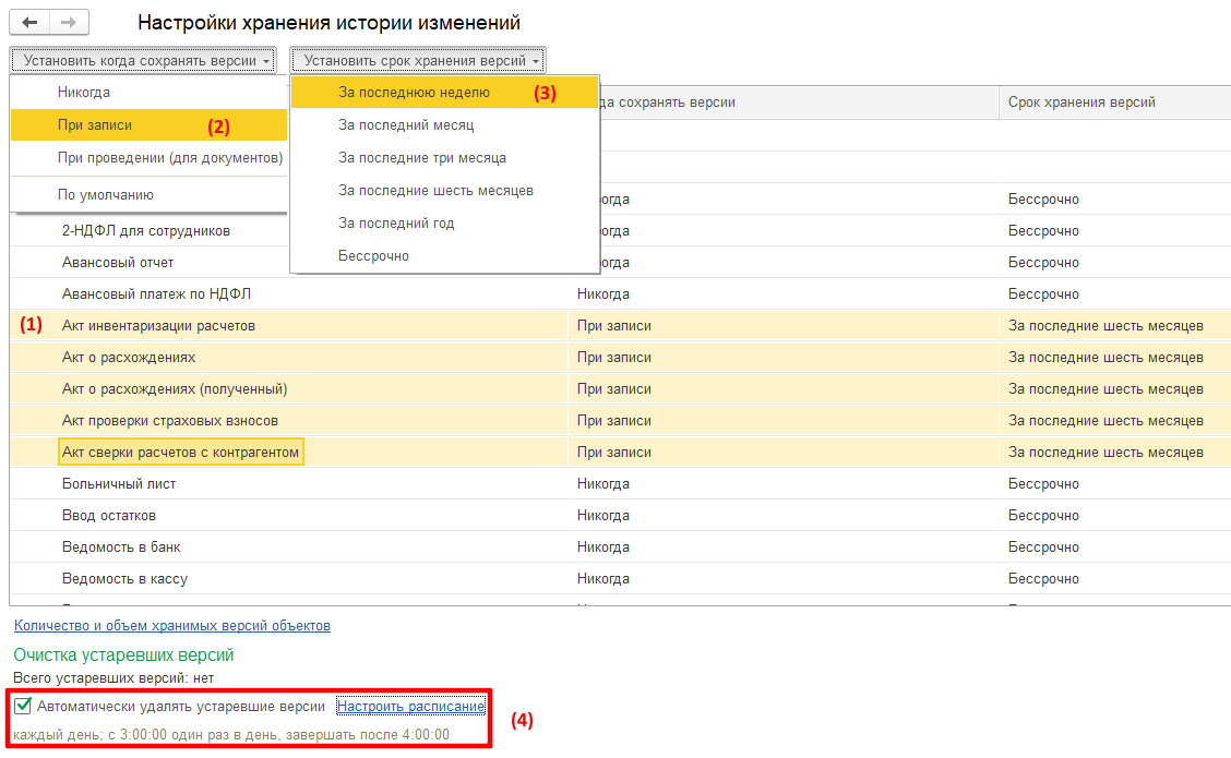 Настройка версионирования объектов (с ручным или автоматическим удалением устаревших версий) 1С. Хранение истории объектов.