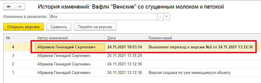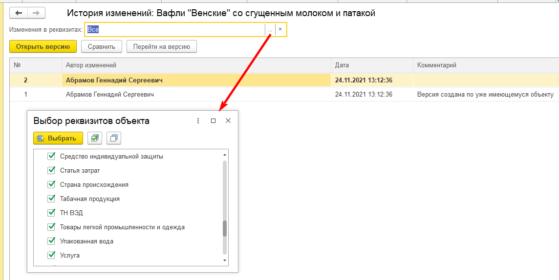 Нажав на кнопку истории изменений, появляются все версии выбранного объекта. И появляется возможность настройки определенных корректировок. Щелкнув на три точки элемента «Изменения в реквизитах», можно определить желаемые реквизиты (Рис. 4).