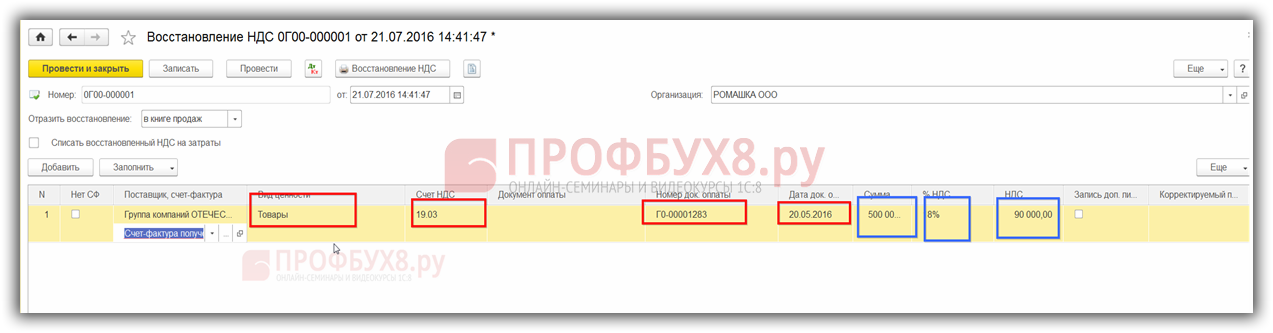 Соответственно, НДС к восстановлению составит 90 000 руб.= 500 000 * 18%: Если нет счета-фактуры, допустим, истек срок хранения, то записи в Книгу продаж можно внести по бухгалтерской справке с расчетом суммы НДС, подлежащей восстановлению. В 1С 8.3 НДС может восстанавливаться по всем документам и операциям, приведенным в открывшемся перечне, при заполнении документа. Все операции записываются аналогично: В результате образуется проводка: Также следует восстанавливать НДС с ранее приобретенной либо построенной недвижимости, которая используется в непроизводственных целях.