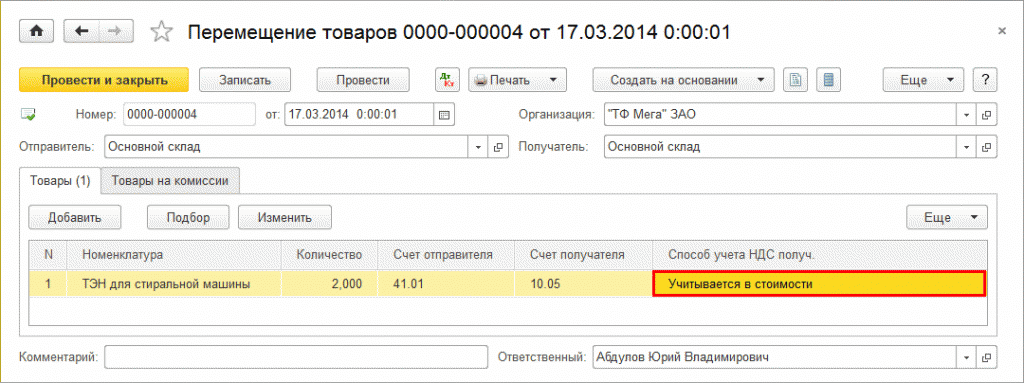 Передача приобретенных для реализации ТЭНов для осуществления гарантийного ремонта в программе «1С:Бухгалтерия 8» редакции 3.0 может быть отражена с помощью документа Перемещение товаров