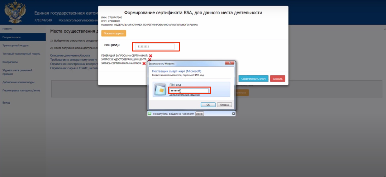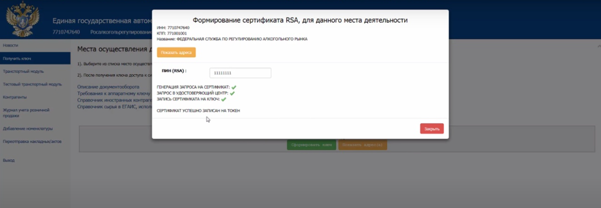 RSA-ключ — это сертификат, необходимый для передачи данных в безопасном режиме. Его можно получить на сайте ЕГАИС и записать на тот же крипто-ключ, что и электронную подпись. Именно для его регистрации вам выдали два пароля вместе с крипто-ключом, они понадобятся далее.