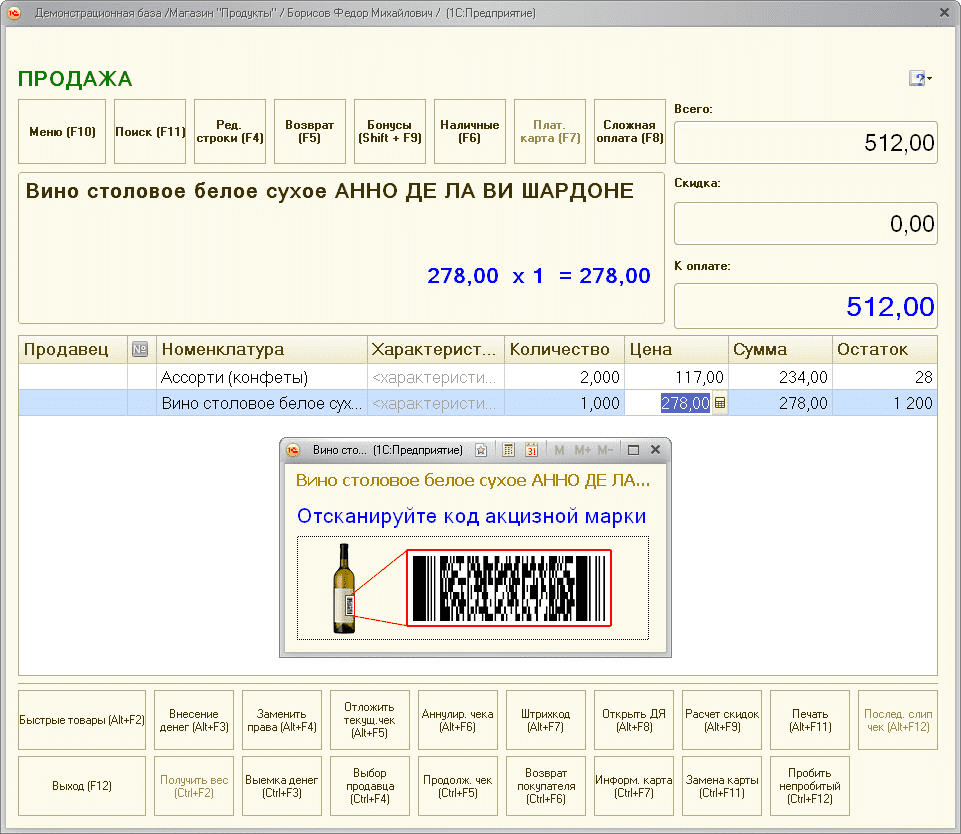 - Кассир сканирует обычный линейный штрих-код, а затем акцизную марку (метка PDF-417), фиксируя факт продажи в ЕГАИС.
