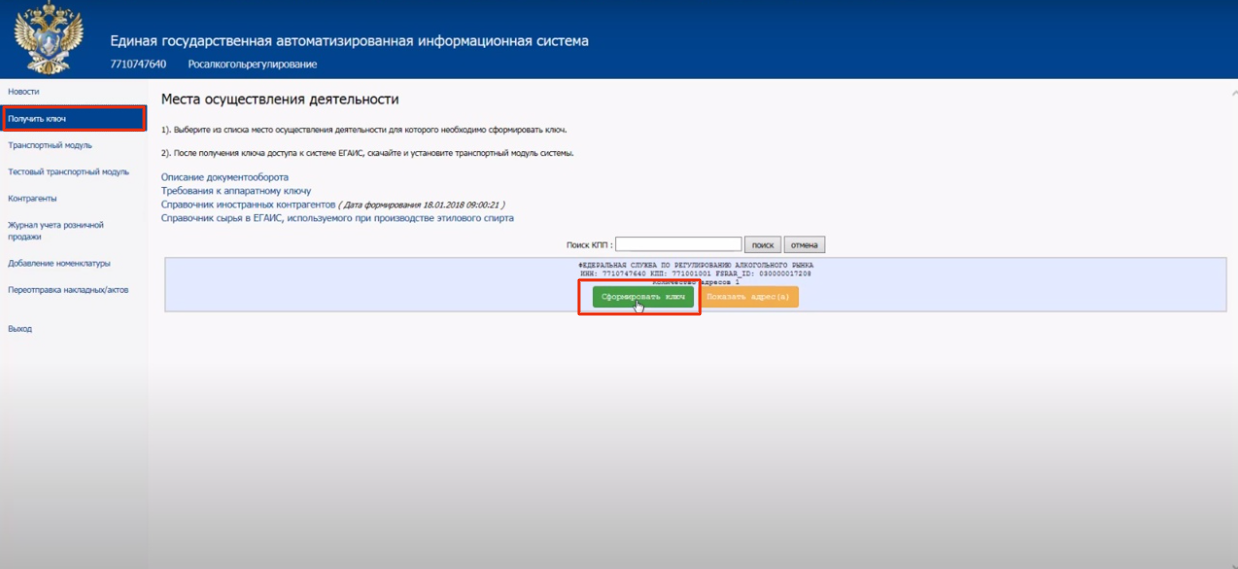 - выбираем в меню сбоку вкладку «Получить ключ» – там высветятся все места деятельности вашей фирмы, для каждого из которых будет нужен отдельный ключ;