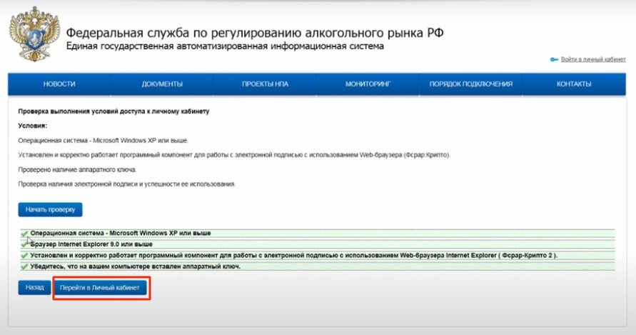 После установки компонента «Фсрар-Крипто 3» нажмите «Начать проверку» заново, теперь все пункты будут отмечены зелеными галочками, а внизу появится нужная кнопка «Перейти в личный кабинет».