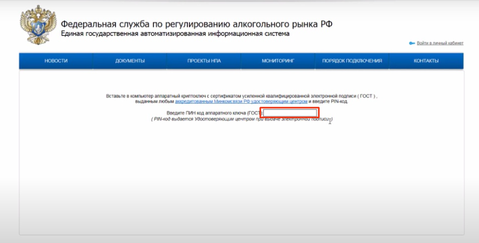 В поле «Введите ПИН код (ГОСТ)» нужно ввести пароль, который выдали вместе с крипто-ключом. Если пароль не выдали, попробуйте стандартный: 1234567890 или 0987654321.