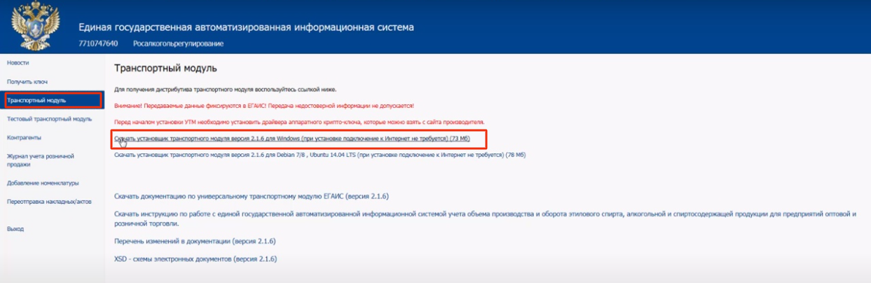 Осталось совсем чуть-чуть. Транспортный модуль — это приложение, которое будет передавать данные от вашей учетной системы на сервер ЕГАИС. Чтобы его установить, в меню нужно выбрать пункт «Установить транспортный модуль», а затем скачать его установщик.