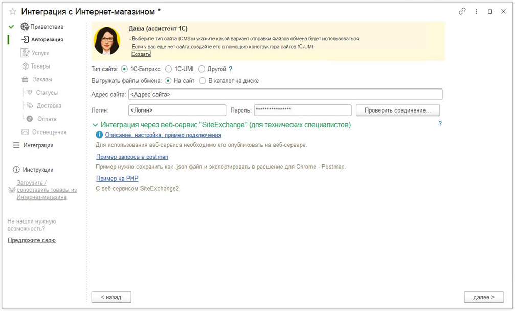 На первом шаге необходимо выбрать «Тип сайта» из предложенных вариантов (1С-Битрикс, 1С-UMI или Другой). Для каждого типа сайта поддерживается передача данных в формате CommerceML, но для типов 1С-Битрикс и 1С-Umi реализованы дополнительные возможности (например, для 1С-UMI можно реализовать запись на услугу на сайте и передавать данные о записи в 1С: УНФ).
