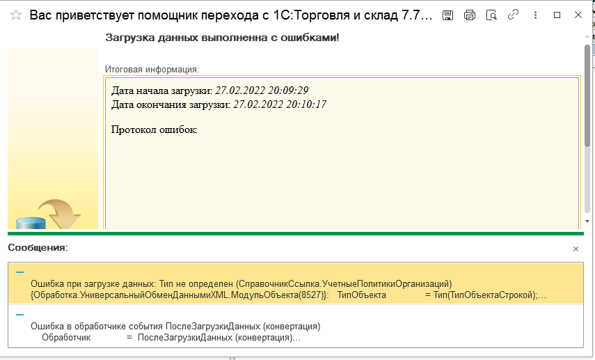 Файл сообщений с ошибками я сохранил в текстовый файл. Но главное для меня было, чтобы выгрузились номенклатура и контрагенты. Остальными справочниками можно было бы пренебречь.