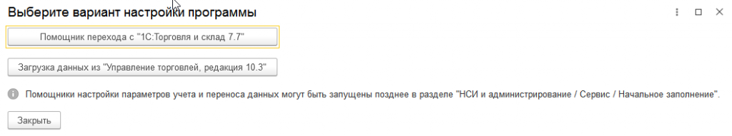 Это важно запомнить, чтобы потом вызвать начальное заполнение из 77 вручную, при последующем запуске, если сейчас закрыть 1С. После вызова помощника перехода с ТиС77 выдается окно, где я выбрал файл переноса: