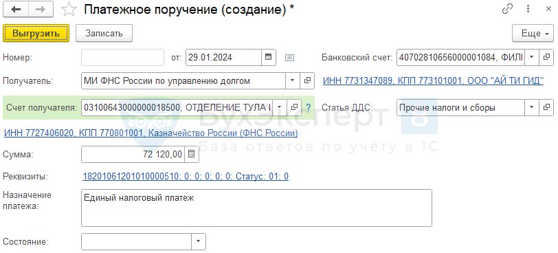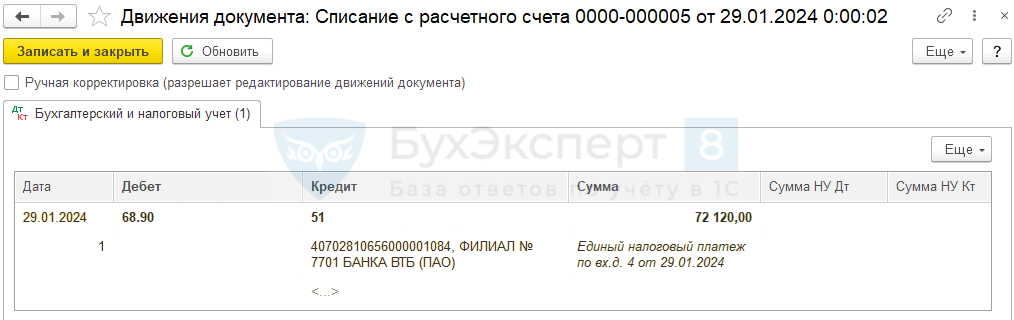 После проведения документа Списание с расчетного счета с Вид операции — Уплата налога, Налог — Единый налоговый платеж на сумму ЕНП сформируется проводка по пополнению ЕНС.