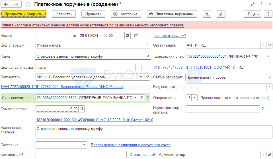 По кнопке Оплатить на все начисленные налоги и взносы формируется общее Платежное поручение по реквизитам ЕНП.