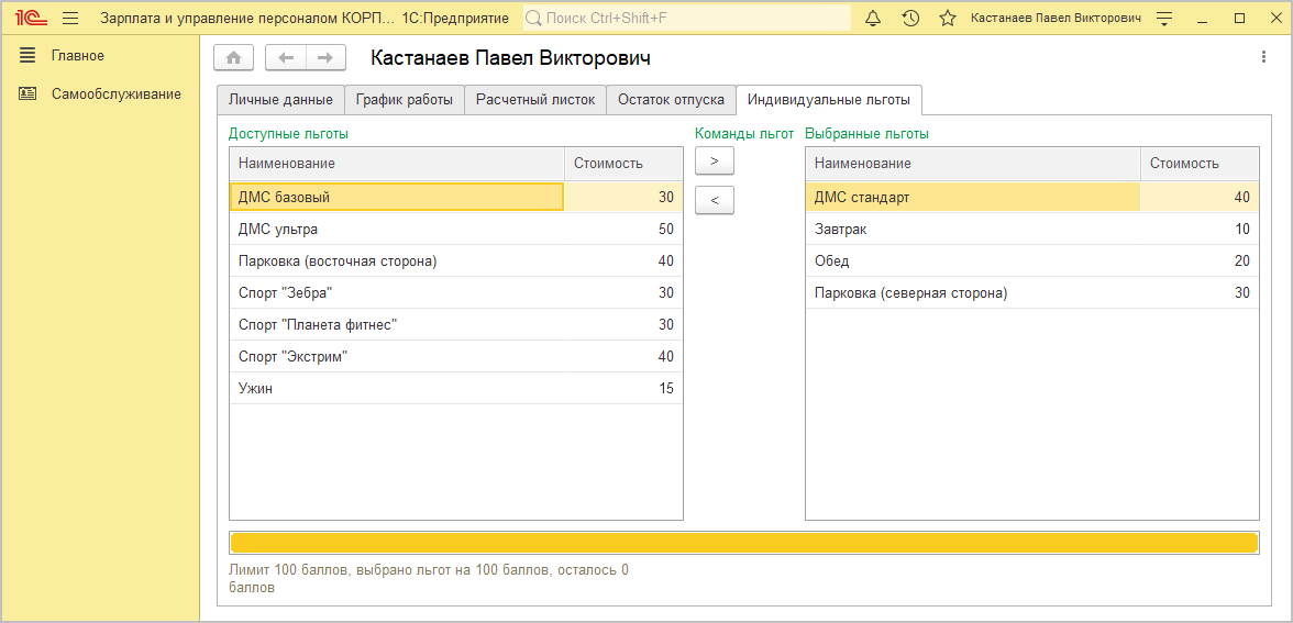 Стоит также упомянуть подсистему самообслуживания в ЗУП КОРП, функциональность которой схожа с возможностями сервиса 1С:Кабинет сотрудника. В разделе «Самообслуживание» сотрудник может проверить корректность его личных данных, увидеть график работы, расчетный листок, остаток отпуска и выбрать доступные индивидуальные льготы.