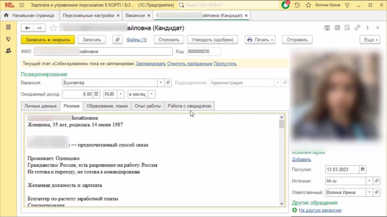 Подбор персонала: построение «воронки кандидатов», пополнение ее за счет интеграции с «работными» сайтами, автоматической загрузкой резюме с HH, SuperJob, Rabota.ru, Зарплата.ру и Авито; возможность парсить файлы резюме из папки или присланные по электронной почте;