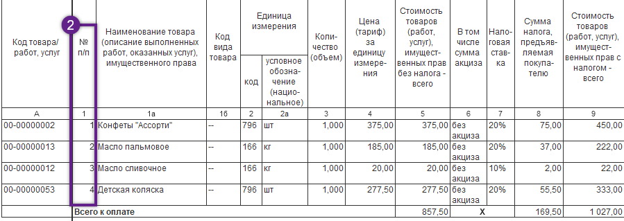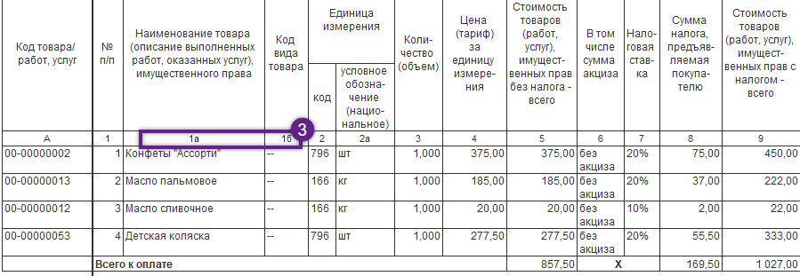 Соответственно колонки «Наименование товара» и «Код вида товара» смещаются в таблице чуть правее и у них изменяется порядковый номер и становится, соответственно 1а и 1б