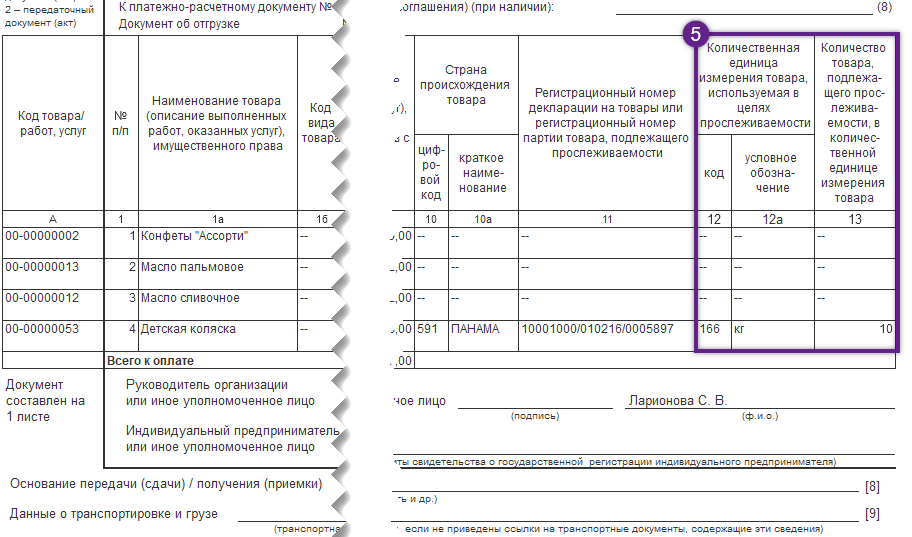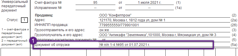 В шапке документа добавляется новая строка 5а, в которой указываются номера и даты документов отгрузки, по которой формируется УПД. Кроме этого, здесь же указываютсяпорядковые номера строк товаров, которые относятся к этому документу.