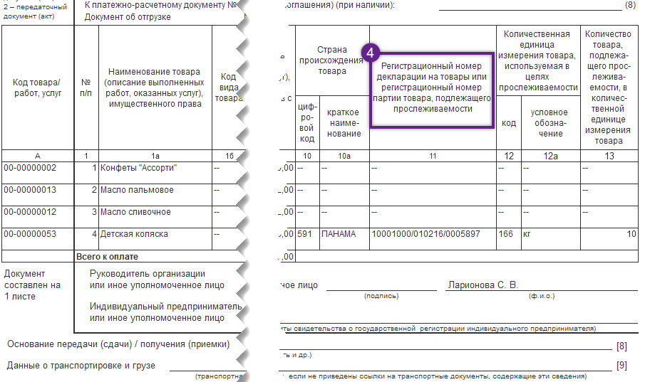 В случае если счета-фактуры в организации подписываются иным лицом, уполномоченным на то приказом (иным распорядительным документом) по организации или доверенностью от имени организации, то в счете-фактуре указывают распорядительный документ или указана должность уполномоченного, подписавшего конкретный счет-фактуру. В документе содержание операции в УПД соответствует счету-фактуре. Допустимо дополнение показателей стр. (3) и (4) информацией об ИНН, КПП грузоотправителя и ИНН, КПП грузополучателя. Показатели, уточняющие условия совершения факта хозяйственной жизни, отражают в стр. (2а), (2б), (3), (4), (5), (6), (6а), (6б), графах (4), (5), (6) и др. |