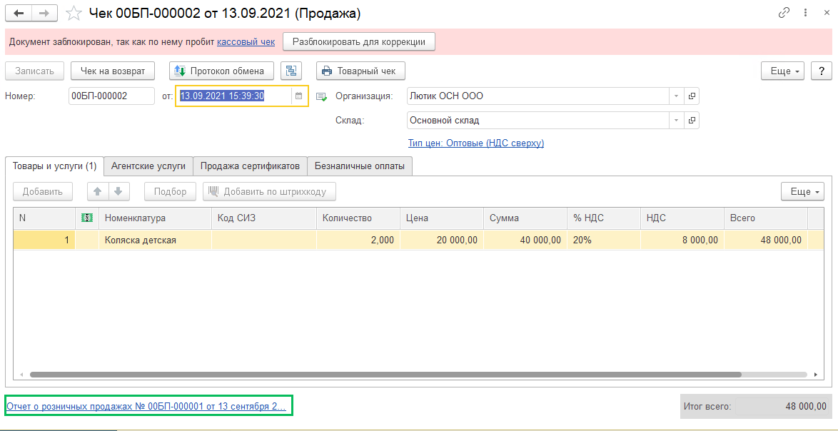 Зеленые галочки свидетельствуют о том, что создался Отчет о розничных продажах. Провалившись в Чек в нижней части формы будет гиперссылка на Отчет о розничных продажах: