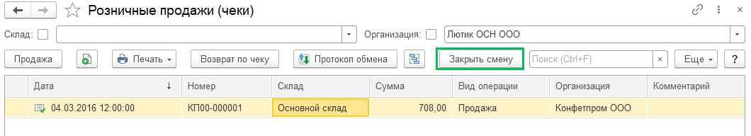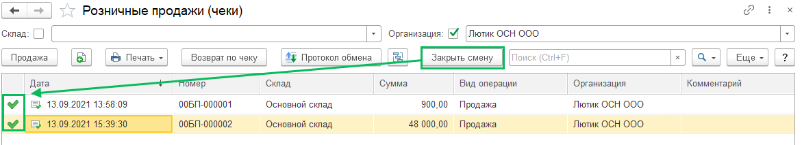 Если кассовая смена закрыта через документ Розничные продажи (чеки), то автоматически будет создан Отчет о розничных продажах, где будут собраны все розничные продажи за смену, также печатается Отчет о закрытии смены (Z-отчет), где отражаются все расчеты за смену.