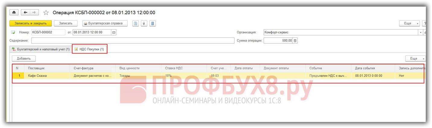 В нашем примере в карточке счета 68.02 оказался «лишним» документ Операция, введенная вручную, который сформировал суммы на счетах бухгалтерского учета, но не сформировал движения по регистру накопления НДС Покупки и не попал в Книгу покупок. То есть в данном случае нужно добавить движение по этому регистру в данном документе. Как это сделать описано подробно в нашей статье.