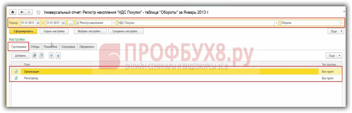 На закладке Группировка по кнопке Добавить добавим строчки Организация и Регистратор. При этом добавили группировку по организации, чтобы увидеть итоговую сумму по организации для удобства сравнения с итоговой суммой в карточке: