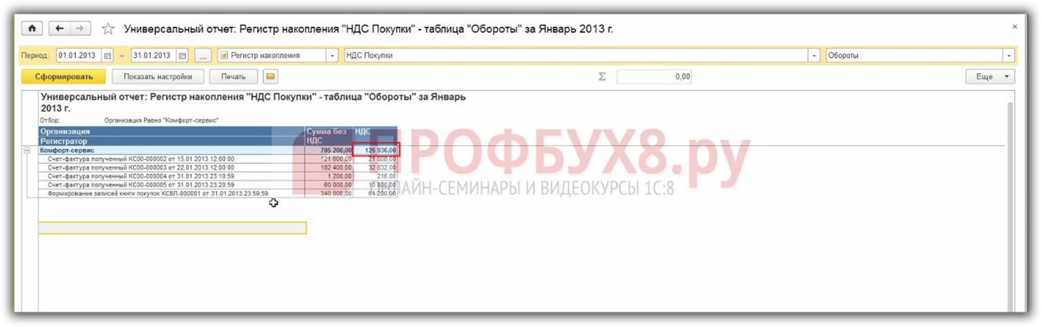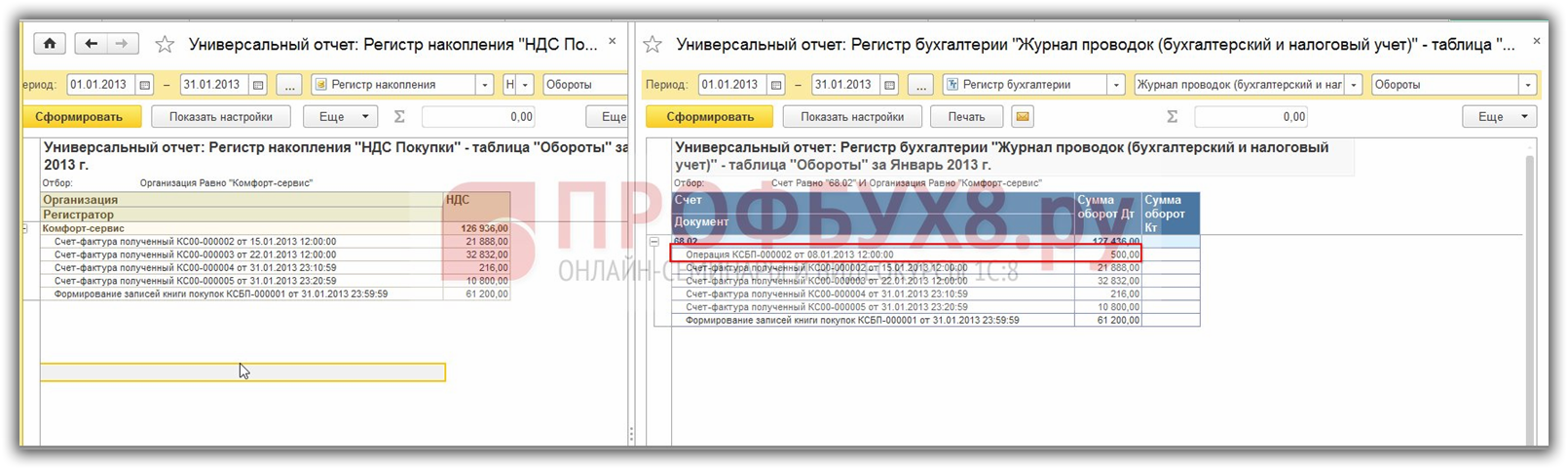В таком виде его легко сравнить с карточкой счета 68.02, так как они имеют похожую структуру. Что позволяет понять какой документ не совершил движения по регистру накопления НДС Покупки или по бухгалтерскому регистру: