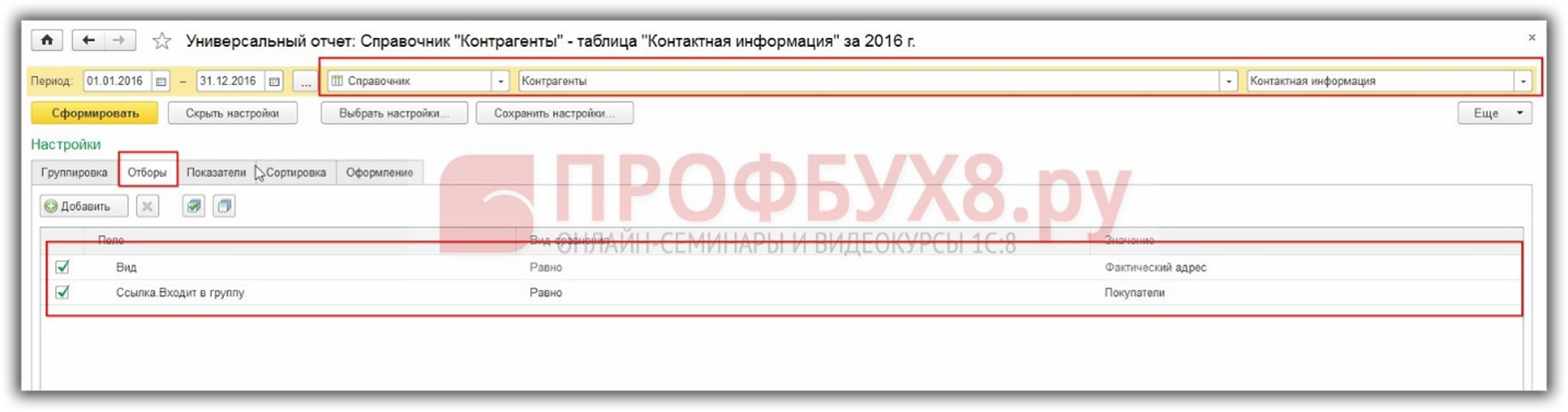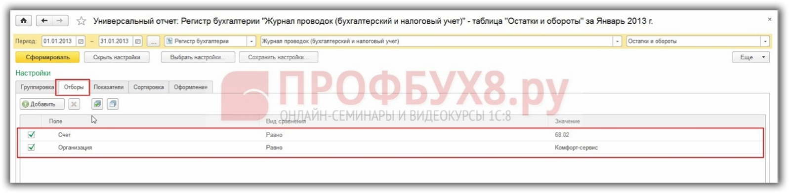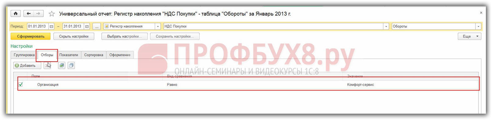На закладке Отбор установим отбор по нужной организации при помощи кнопки Добавить: